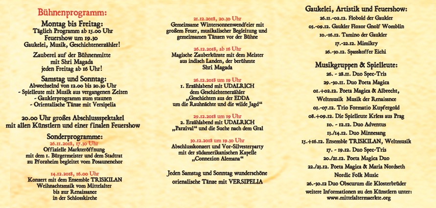Das Jahr 2018 neigt sich dem Ende zu. Die Weihnachtsmärkte haben geschlossen, doch noch bis zum zum 30.12. habt ihr Gelegenheit, den weihnachtlichen Mittelaltermarkt in der Pforzheimer Stadtmitte zu besuchen.